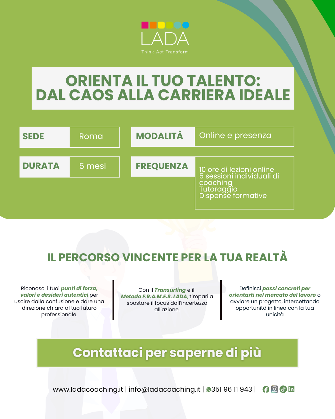 È un percorso di orientamento e riprogettazione professionale che integra Transurfing e Metodo F.R.A.M.E.S. di LADA Coaching, per passare dal “non so da dove cominciare” a un progetto di carriera concreto e allineato a chi sei.